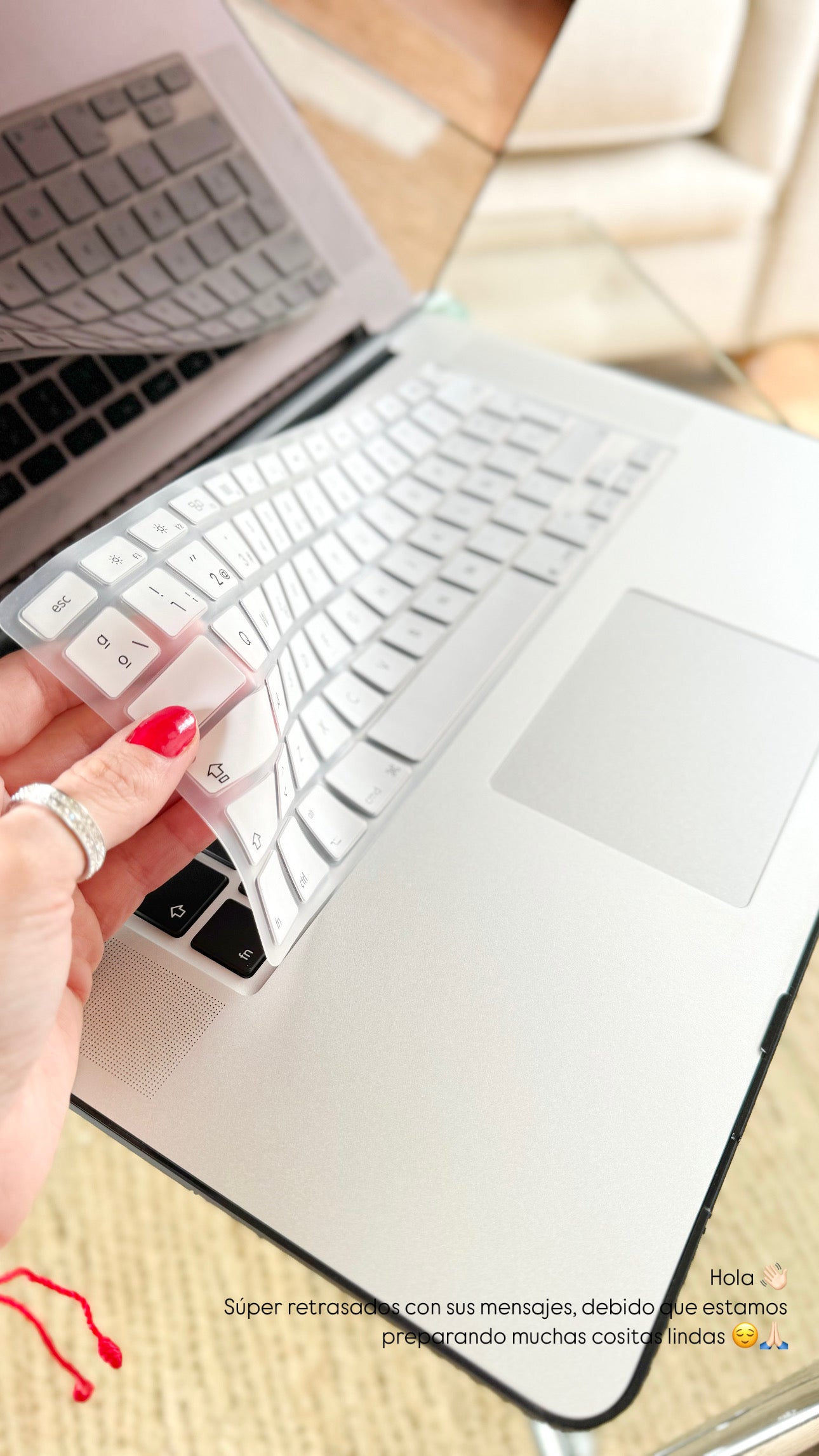 Incluye tapa de arriba en diseño mármol recubierta de silicona suave y lavable y tapa de abajo en silicona suave combinando con diseño. Protector de teclado en idioma según su elección.
